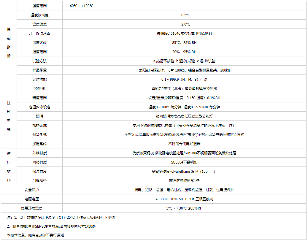 光伏濕凍試驗(yàn)箱適用于光伏組件(太陽能電池板)做熱循環(huán)、濕凍循環(huán)、高溫高濕雙85試驗(yàn),以確認(rèn)組件能否承受高溫高濕之后隨之的負(fù)溫度影響,以及對于溫度重復(fù)變化時引起的疲勞和熱失效,另外確定光伏組件曝露在高濕度下而產(chǎn)生的熱應(yīng)力及能夠抵抗?jié)駳忾L期滲透的能力.是光伏組件行業(yè)必不可少的測試設(shè)備。