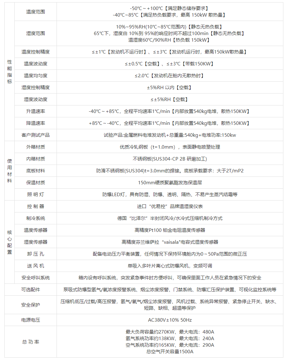 升溫速率 | -40℃~+85℃,全程平均速率1℃/min【內(nèi)部放置540kg電堆,散熱150KW】 | |